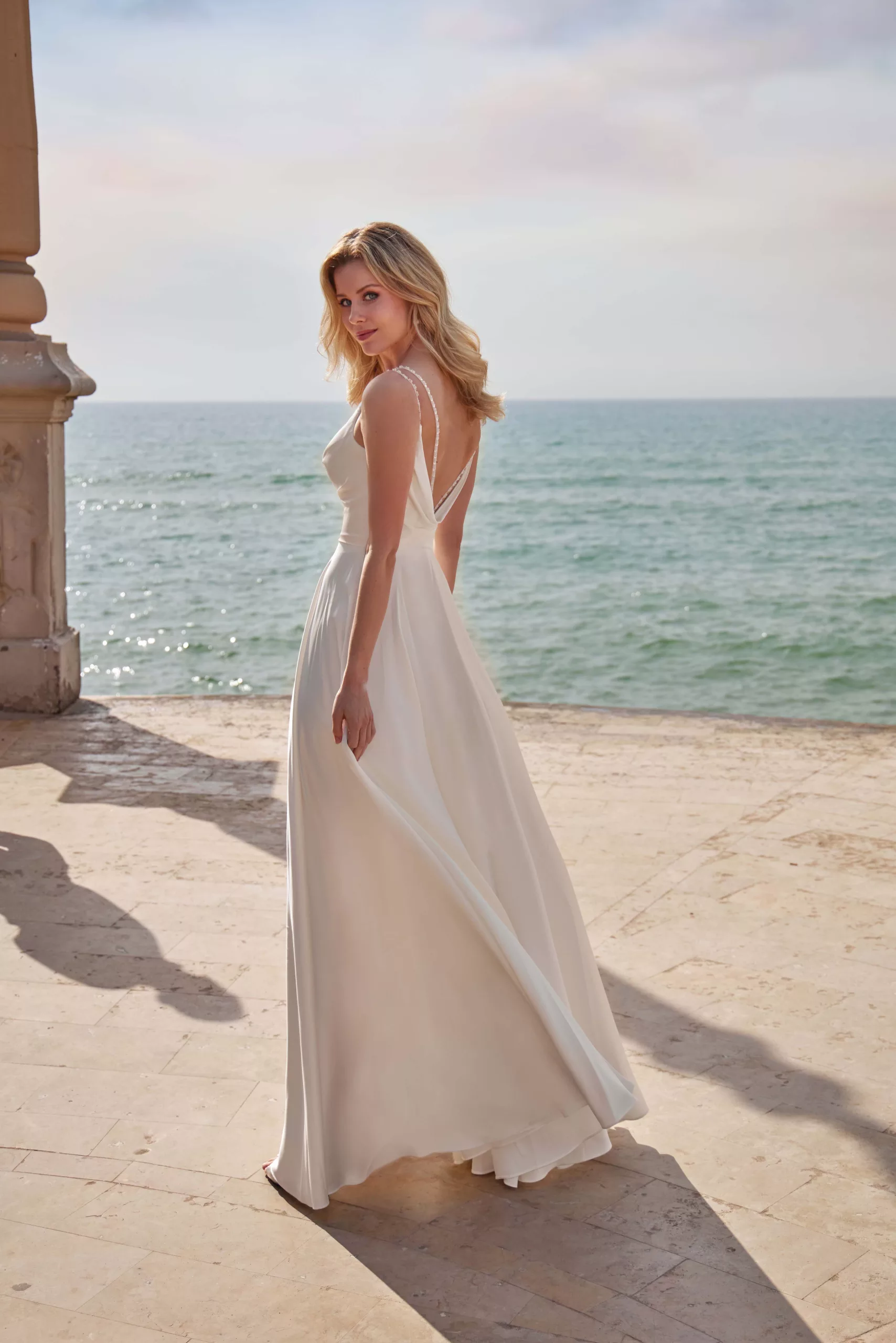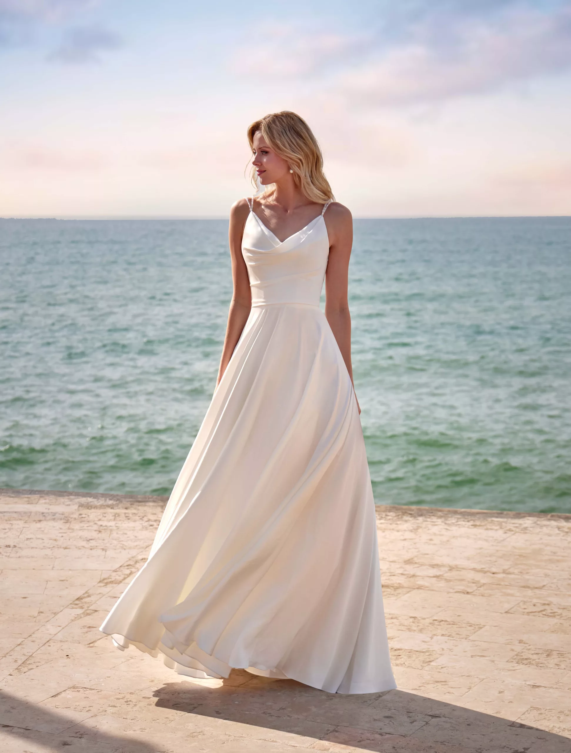 Magnifique robe en satin de la marque créatif. Cette robe toute en simplicité saura vous séduire par son tomber parfait au niveau du buste avec un joli travail de drapé. La jupe est ample mais se porte sans jupon. Vous saurez apprécier les détails de cette création notamment avec ses bretelles en strass.