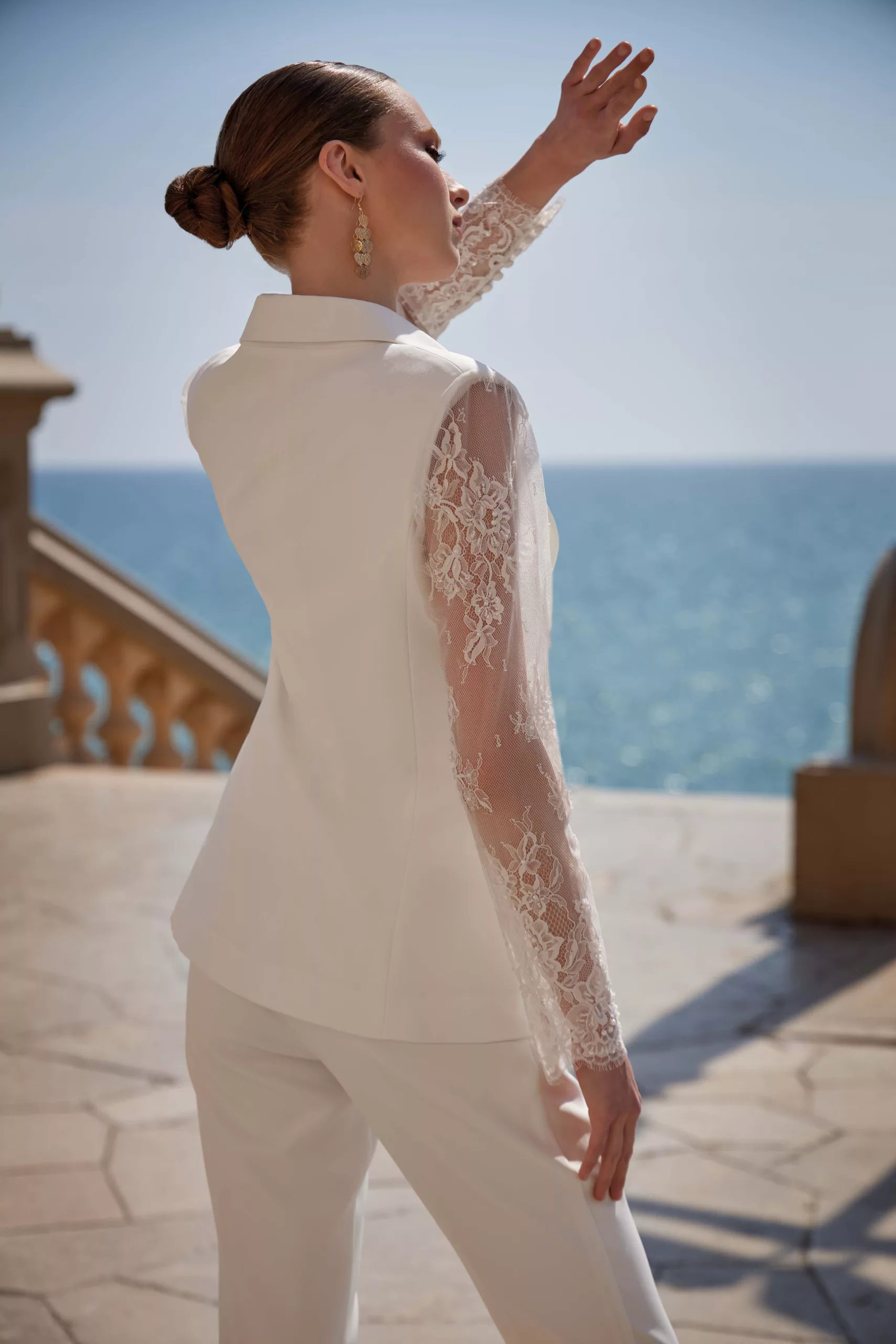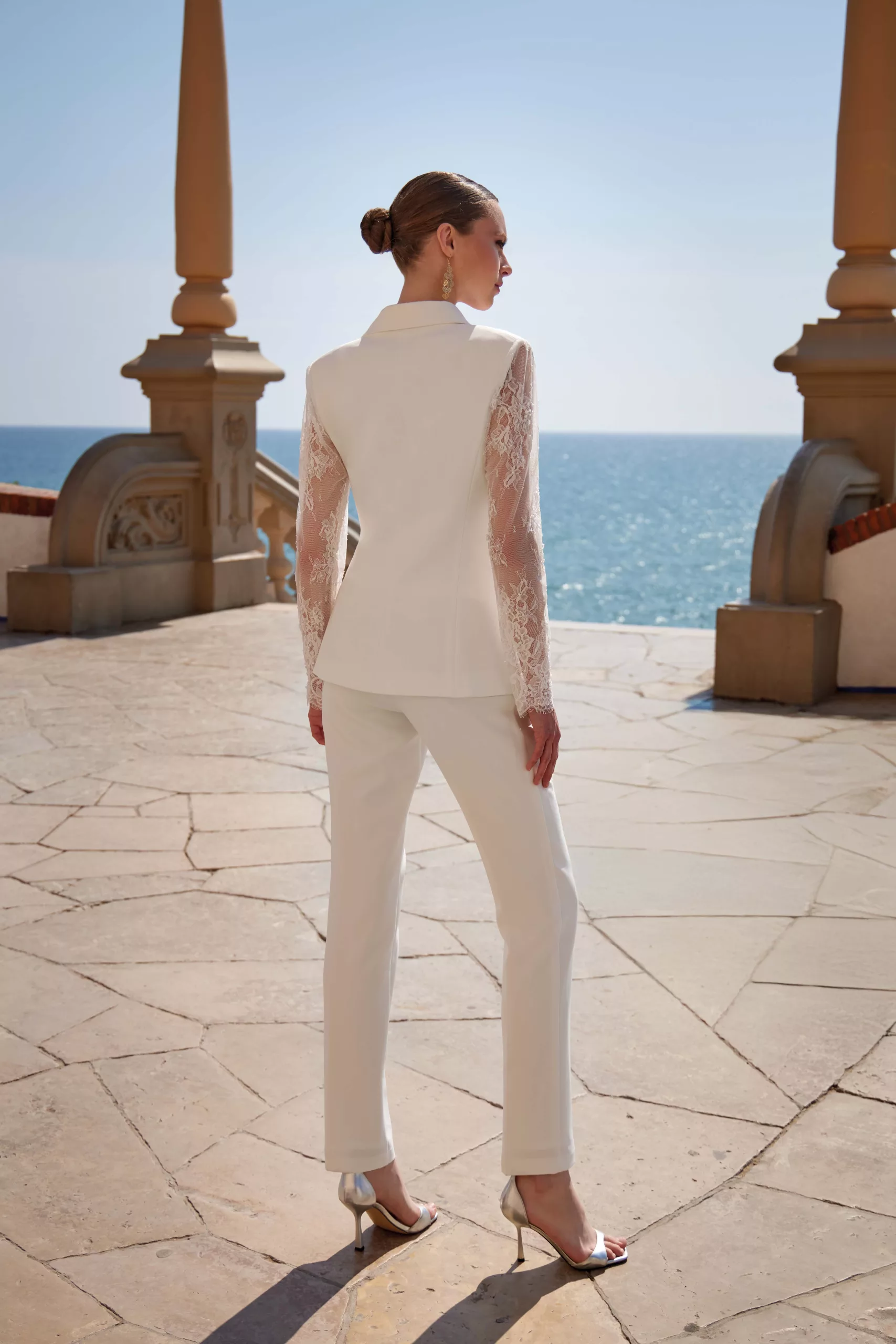 Superbe ensemble comprenant top, pantalon et veste. Le tout est confectionné en crêpe avec une touche de dentelle pour les manches.