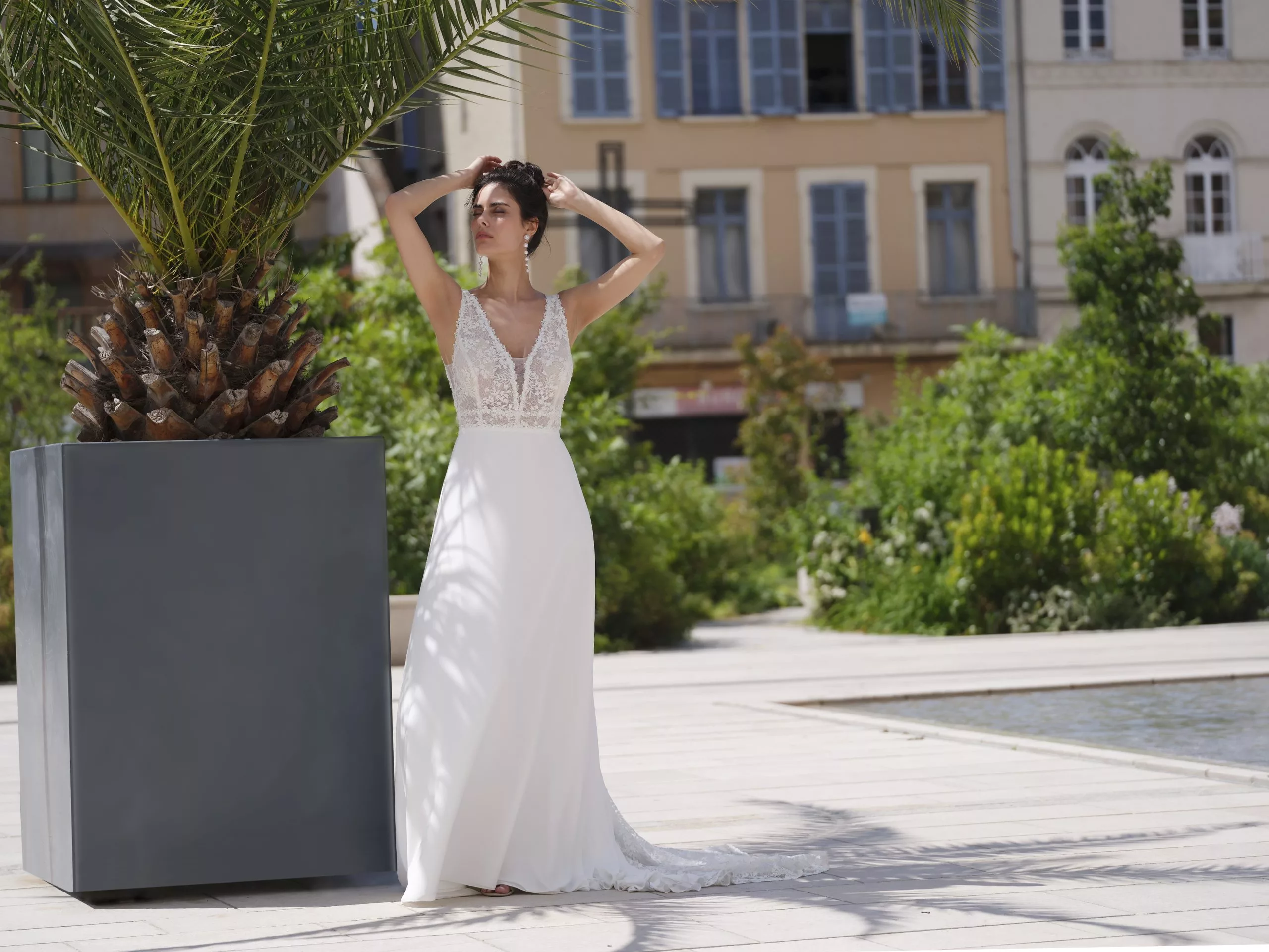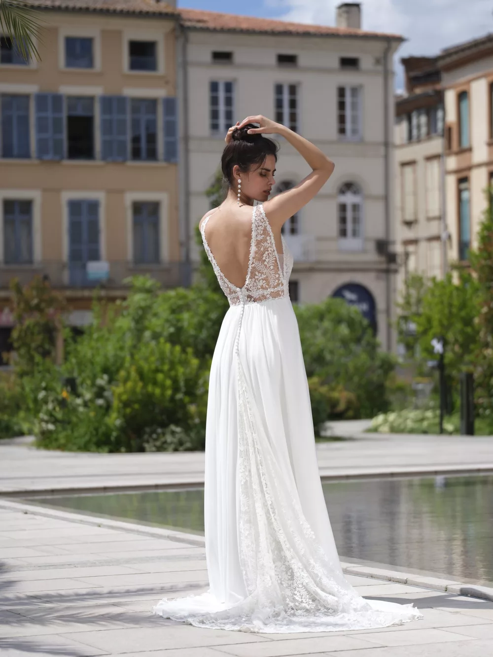 La traîe est assez originale car elle s’ouvre sur une grande quille en dentelle.