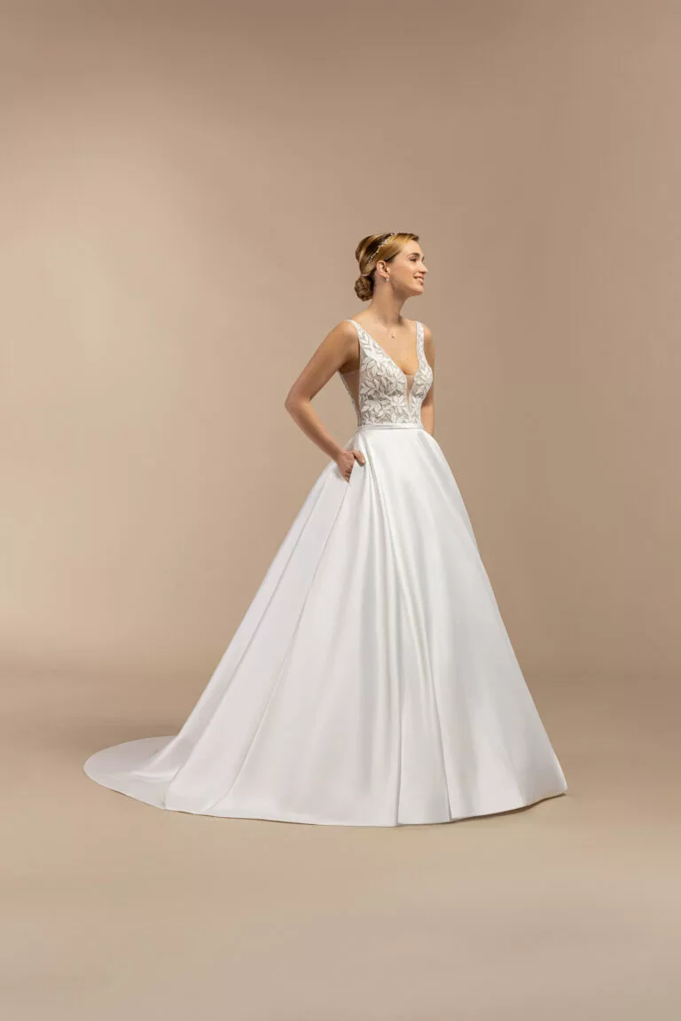 Le bas de la robe se compose d’une jupe en mikado et d’un haut en dentelle avec des motifs floraux.