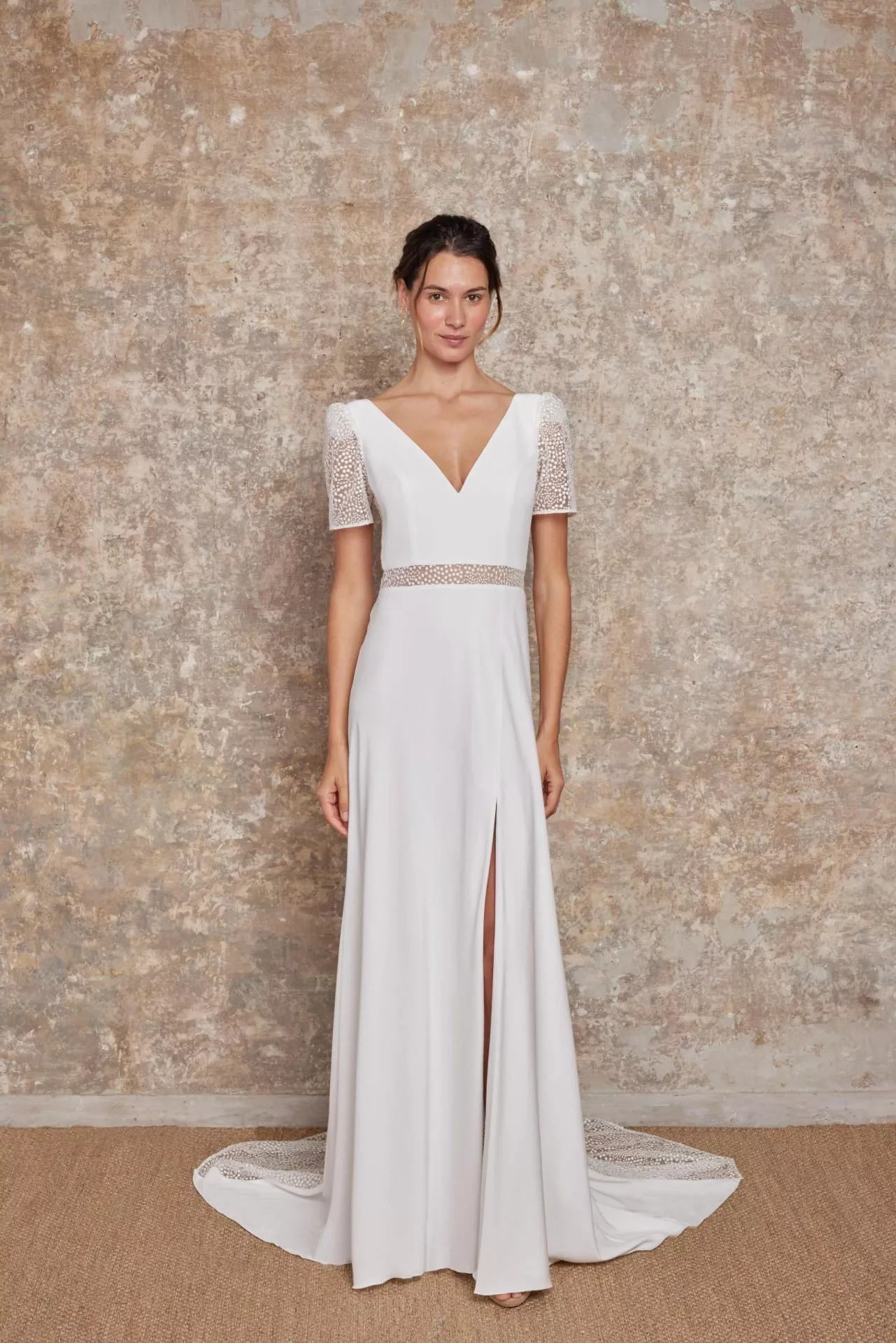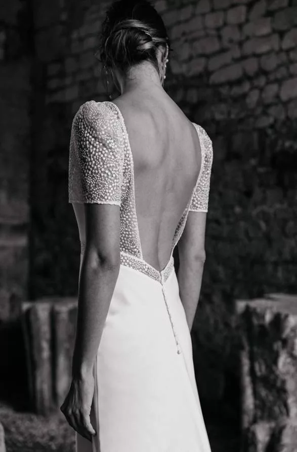 Robe fluide, moderne et sensuelle avec sa jupe fendue, son large décolleté dos et sa quille en tulle brodé en transparence.